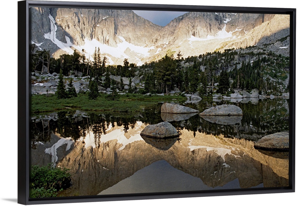 <p>From the National Geographic Collection, a large photograph focuses on a small body of water reflecting the surrounding mountainous landscape over its calm surface. Near the shoreline, trees can be scattered at the foot of the mountains, while small patches of snow cover the rough sides of the mountains.</p>