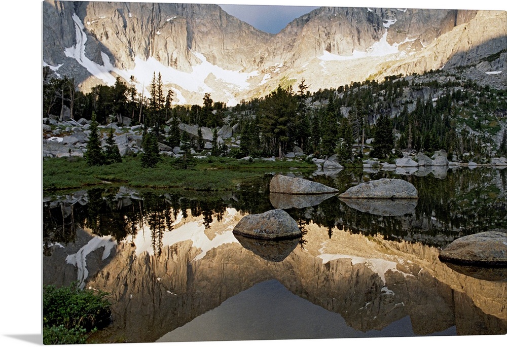<p>From the National Geographic Collection, a large photograph focuses on a small body of water reflecting the surrounding mountainous landscape over its calm surface. Near the shoreline, trees can be scattered at the foot of the mountains, while small patches of snow cover the rough sides of the mountains.</p>