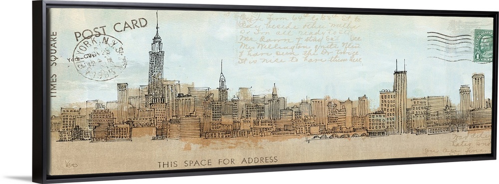<p>A philately inspired illustration of the NYC skyline with stamps and a hand written note on a panoramic shaped canvas.</p>