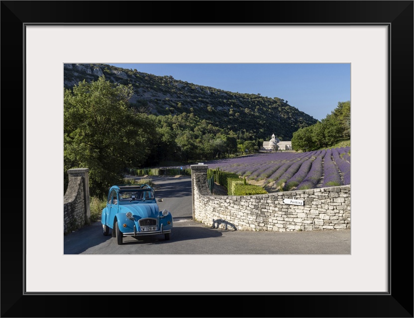 <p>France, Provence-Alpes-Cote d'Azur, Gordes, Citroen 2CV in front of Senanque abbey (abbaie de Senanque) & field of lavender</p>