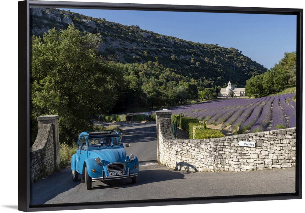 <p>France, Provence-Alpes-Cote d'Azur, Gordes, Citroen 2CV in front of Senanque abbey (abbaie de Senanque) & field of lavender</p>
