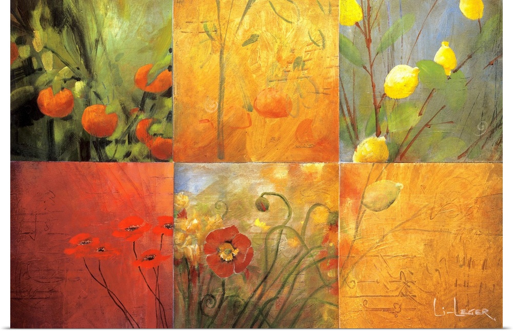 <p>Artwork of flowers and fruit in a six square grid design.</p>