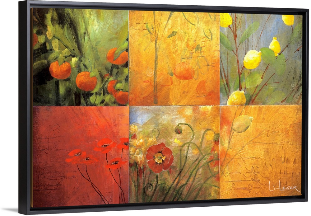 <p>Artwork of flowers and fruit in a six square grid design.</p>