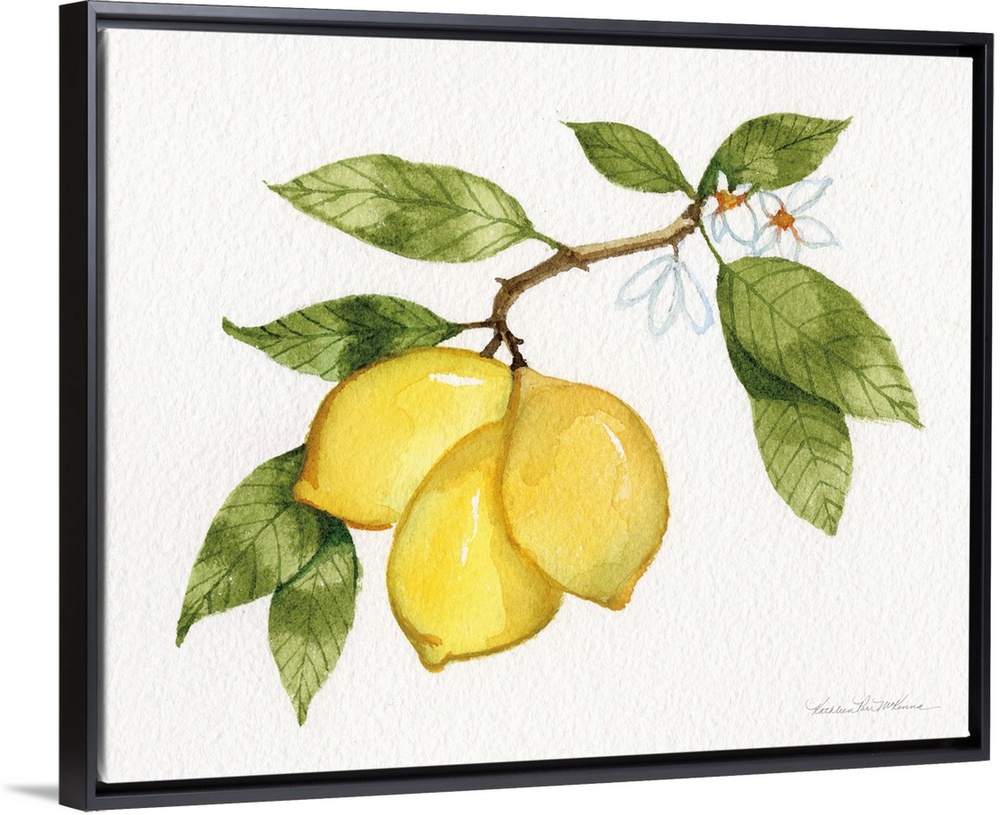 <p>Contemporary artwork of a branch of lemons on a neutral backdrop.</p>