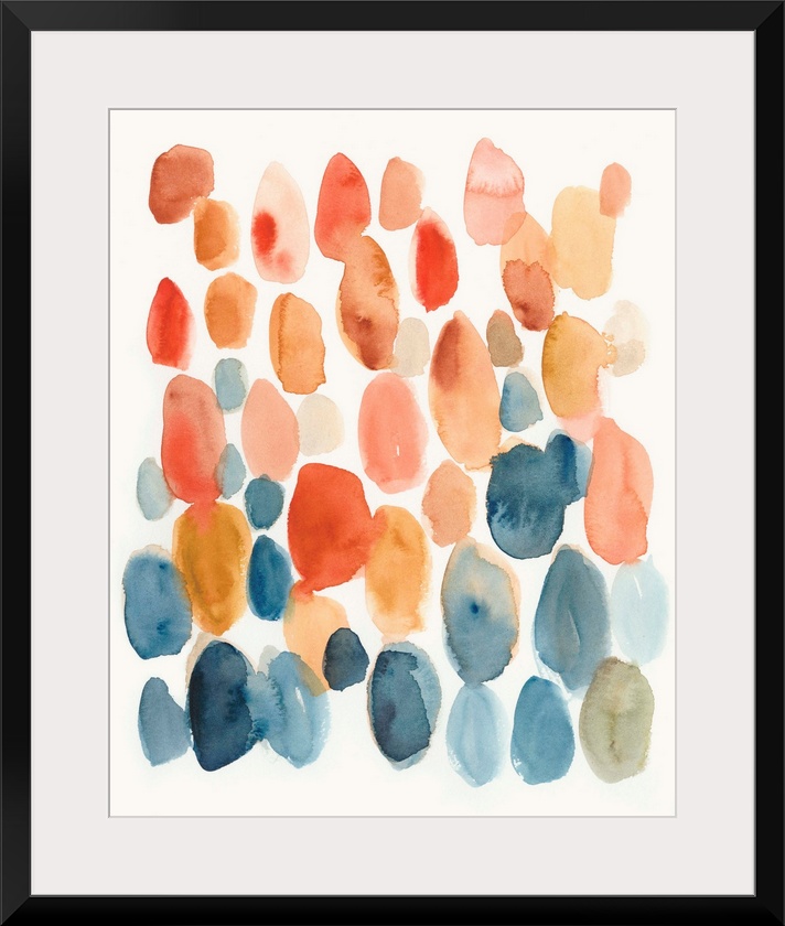 <p>Watercolor abstract with oblong shapes in indigo, coral, and orange colors on a white background.</p>