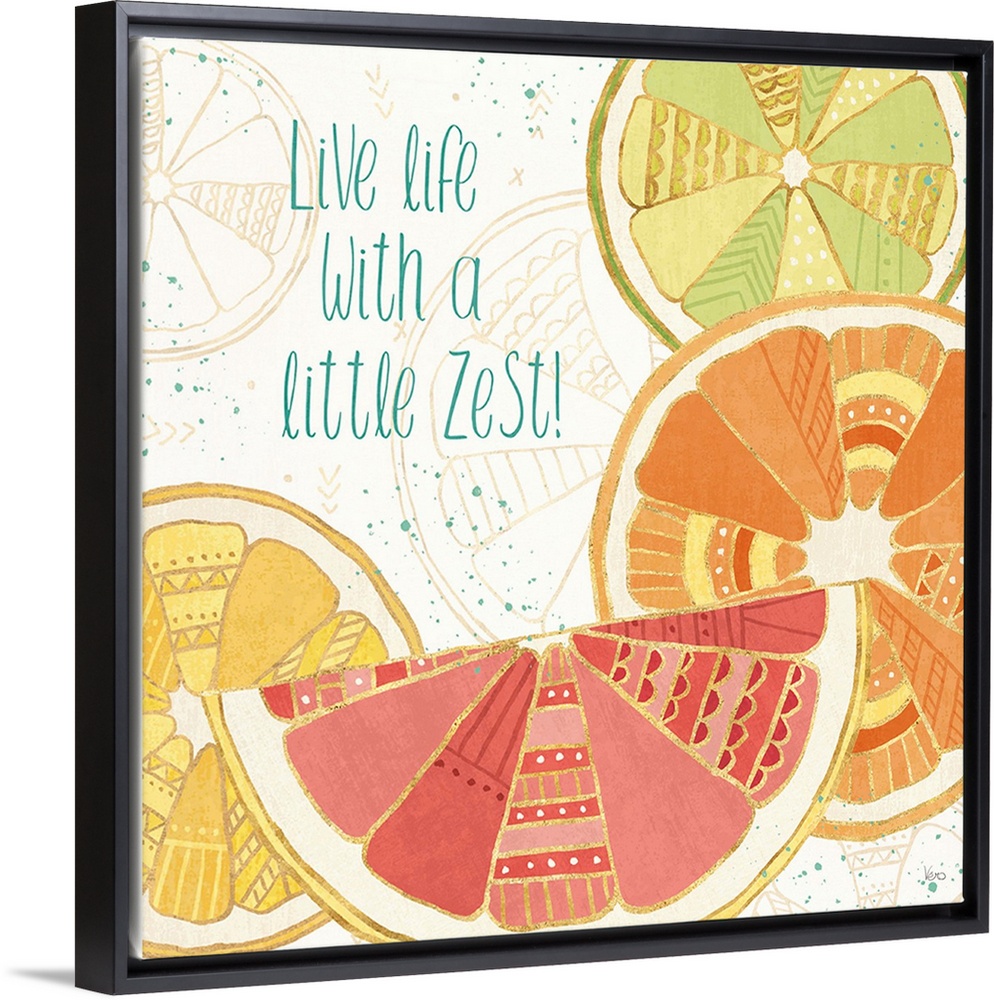 <p>Decorative colorful artwork of sliced fruits with geometric designs and the phrase, 'Live life with a little zest!'.</p>