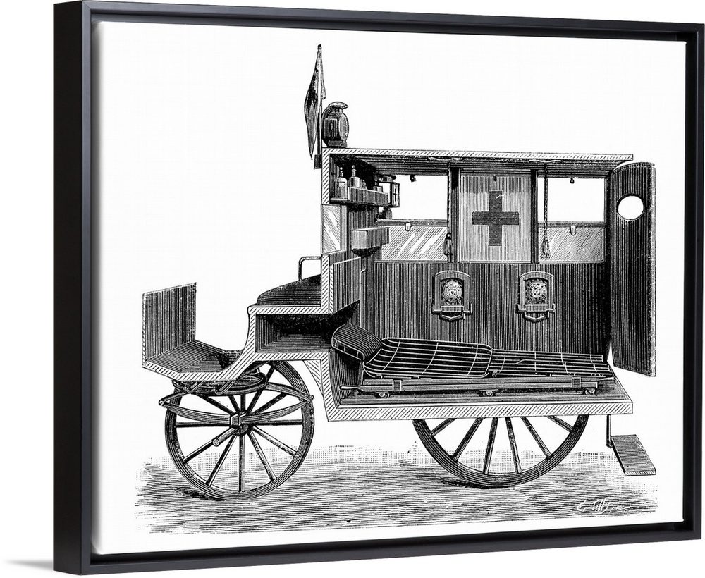 <p>City ambulance, shown in cutaway form to reveal its interior with a stretcher and bed for the patient. This early ambulance would have been drawn by horses, with the driver sitting on the external seat at left. The first hospital-based ambulance services were established in the 1860s. This ambulance includes the red cross symbol on the side and on a flag, long with a lamp next to the flag. Artwork from the eighth volume (second period of 1891) of the French popular science weekly 'La Science Illustree'.</p>