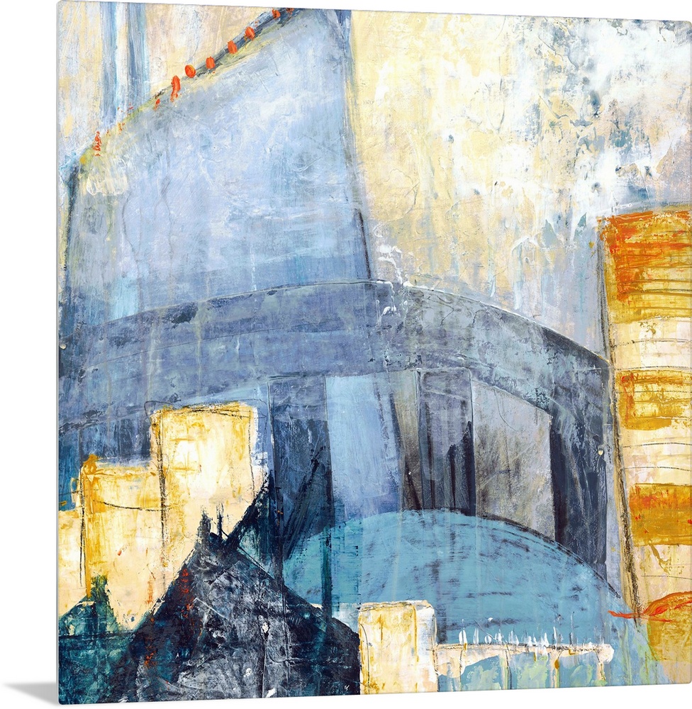 <p>Square abstract painting of a cityscape using shades of blue, yellow, orange, and grey.</p>