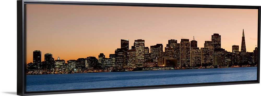 <p>Horizontal image on canvas of the San Francisco skyline lit up at sunset by the water.</p>