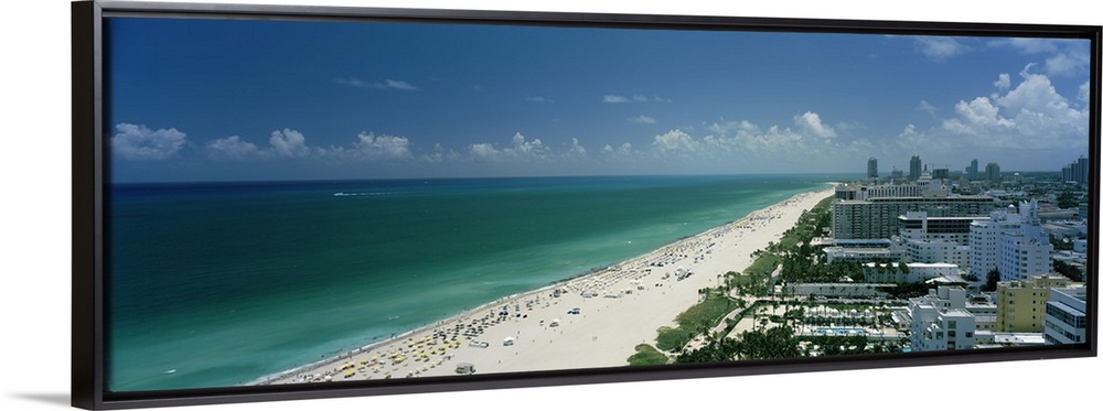 <p>An aerial photograph is taken of the coast in Miami showing a busy beach lined by the teal ocean water.</p>