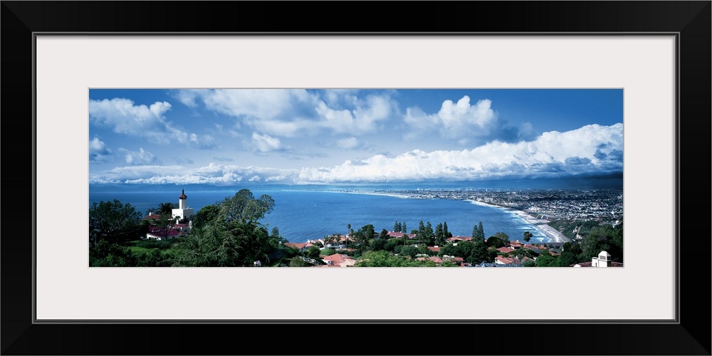 <p>Large panoramic print of a city along the Pacific Ocean with big billowing clouds in the distance.</p>