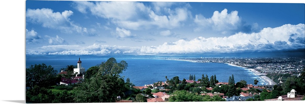 <p>Large panoramic print of a city along the Pacific Ocean with big billowing clouds in the distance.</p>