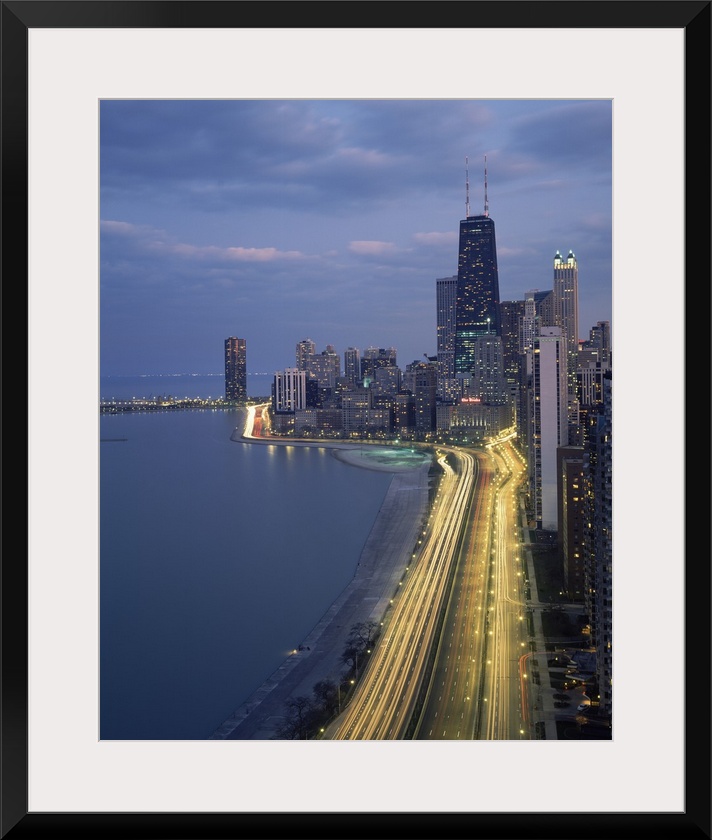 <p>Vertical panoramic photograph at dusk with city skyline in the distance and busy highway and streets covered with light trails created by cars in the foreground.</p>