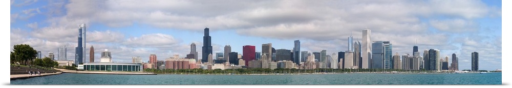 <p>Panoramic photograph on a giant wall hanging of the Chicago skyline along the waterfront of Lake Michigan, beneath a blue sky with large clouds.</p>