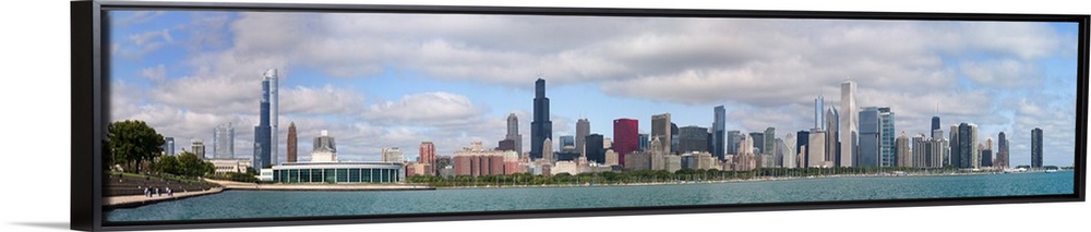 <p>Panoramic photograph on a giant wall hanging of the Chicago skyline along the waterfront of Lake Michigan, beneath a blue sky with large clouds.</p>