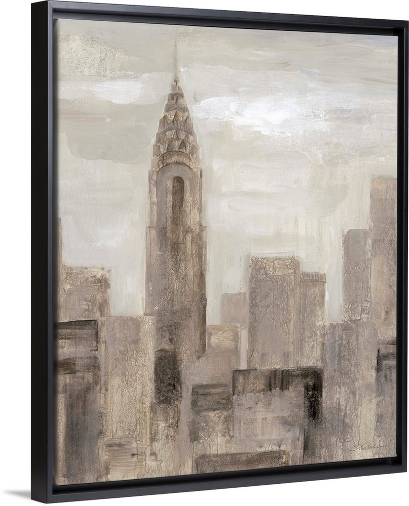 <p>Neutral toned abstract painting of the New York City skyline with the Chrysler Building.</p>