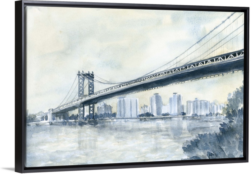 <p>Contemporary watercolor painting of an urban bridge spanning a river, with a city skyline in the distance.</p>