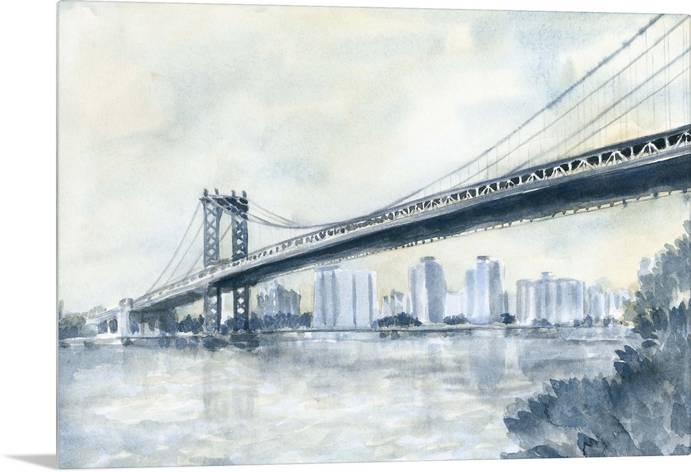 <p>Contemporary watercolor painting of an urban bridge spanning a river, with a city skyline in the distance.</p>