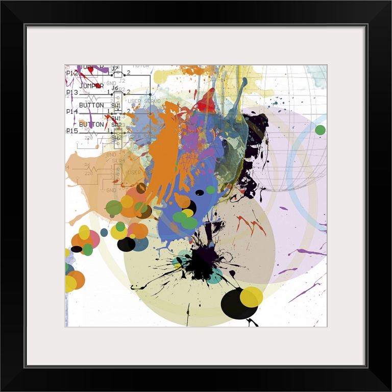 <p>Big, square, contemporary artwork of splatters of multi-colored paint on a background of lined panels and a three dimensional grid of Earth.</p>