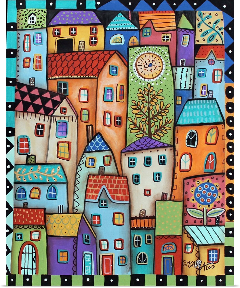 <p>Contemporary painting of a village made of different colored houses.</p>