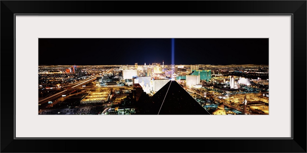 <p>Giant, wide angle landscape photograph of Las Vegas at night, taken looking downward from Mandalay Bay Resort and Casino.</p>