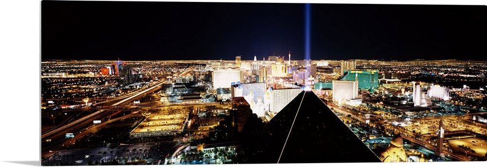 <p>Giant, wide angle landscape photograph of Las Vegas at night, taken looking downward from Mandalay Bay Resort and Casino.</p>