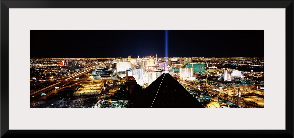 <p>Giant, wide angle landscape photograph of Las Vegas at night, taken looking downward from Mandalay Bay Resort and Casino.</p>