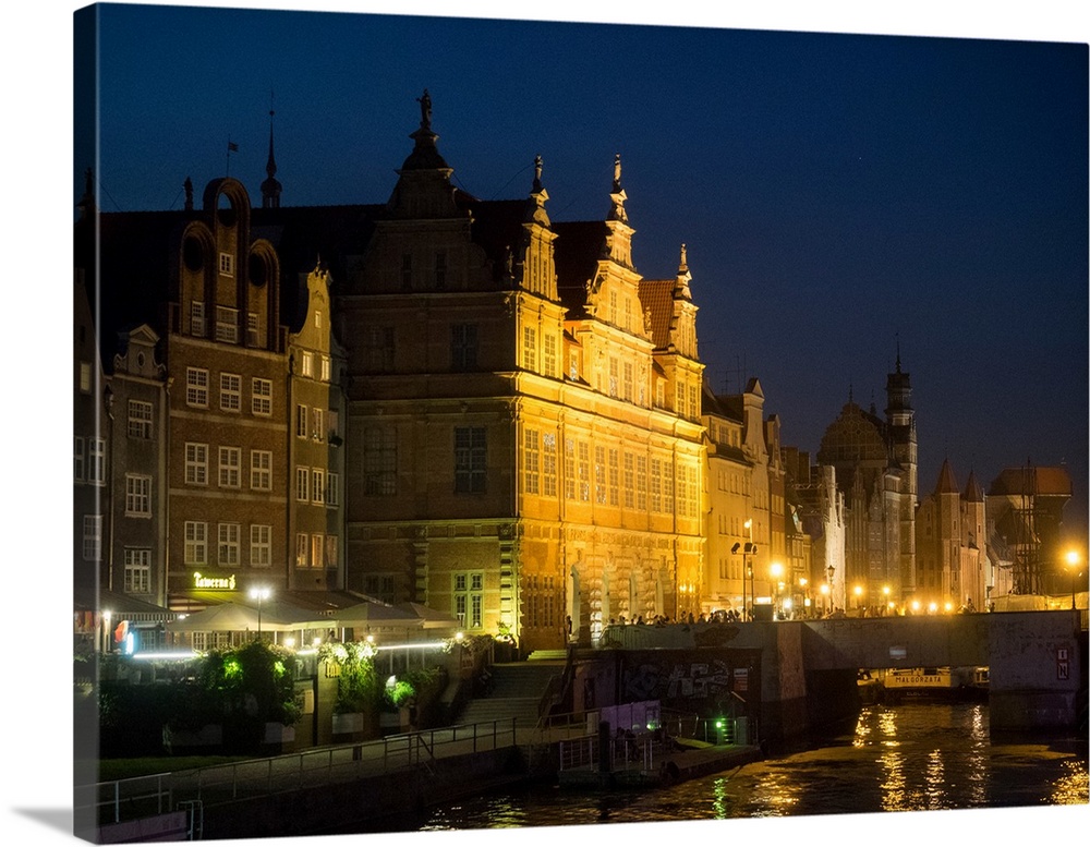 <p>City gate at the waterfront during night, Green Gate, Motlawa River, Gdansk, Poland</p>