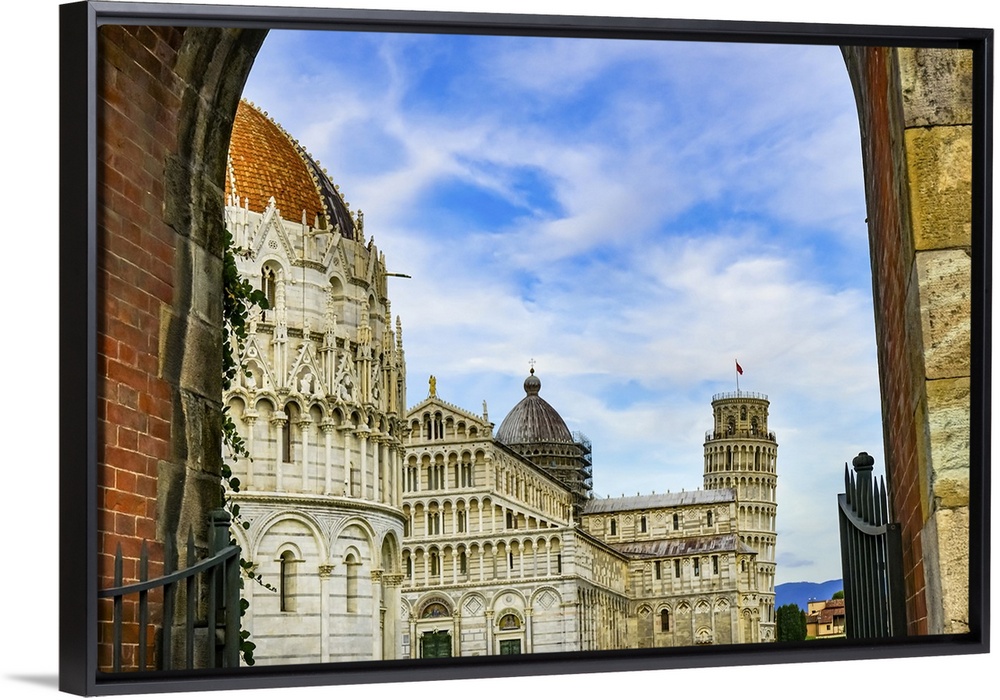 <p>City gate of Piazza del Miracoli with Leaning Tower of Pisa and Pisa Baptistery of St. John, Tuscany Italy. Completed in 1300's.</p>