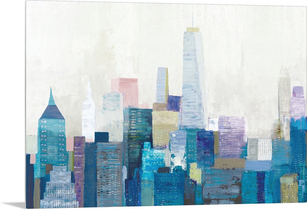 <p>A multi-color painting of the city skyline of New York City.</p>