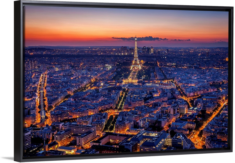 <p>An aerial photograph of Paris at night with the Eiffel tower seen standing tall.</p>