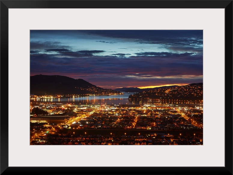 <p>City lights, south Dunedin and Otago harbor, Dunedin, South Island, New Zealand.</p>