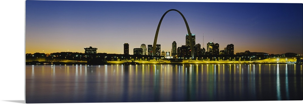 <p>Panoramic photograph of skyline featuring the St. Louis Arch and waterfront at dusk.</p>