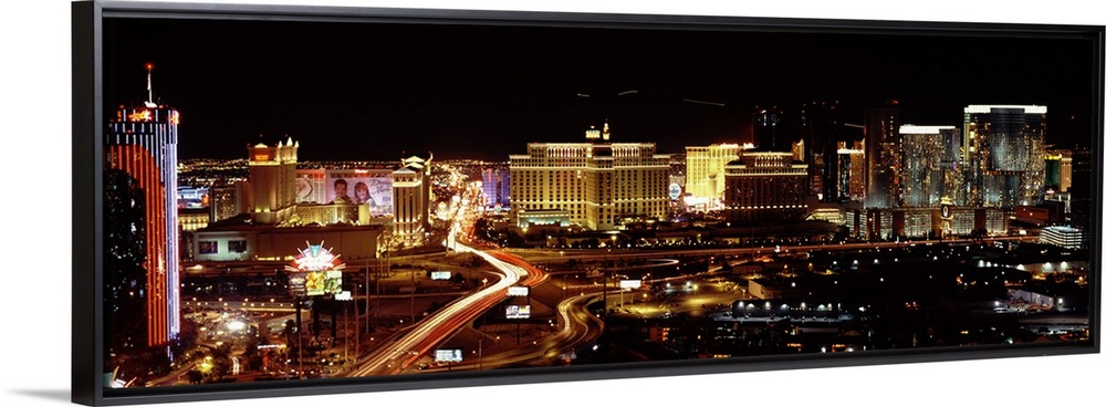 <p>A time lapsed photograph of a car lights streaming through the city road ways with the all the lights from the casinos in the night sky.</p>