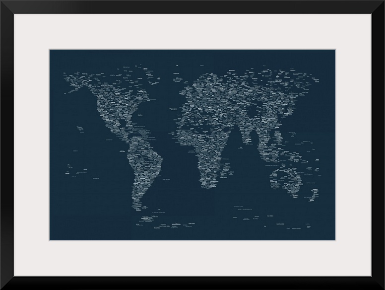 <p>Huge illustration shows a map of Earth by plotting the names of big cities to represent the outlines of landmasses. Artist places the names of the cities in a single light color, while the background is a solid dark tone.</p>