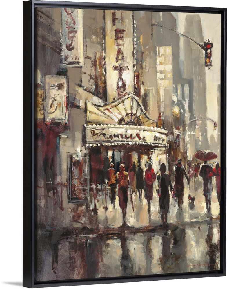 <p>Painting of city streets with people casting reflections on a wet road, with a theater in the background.</p>