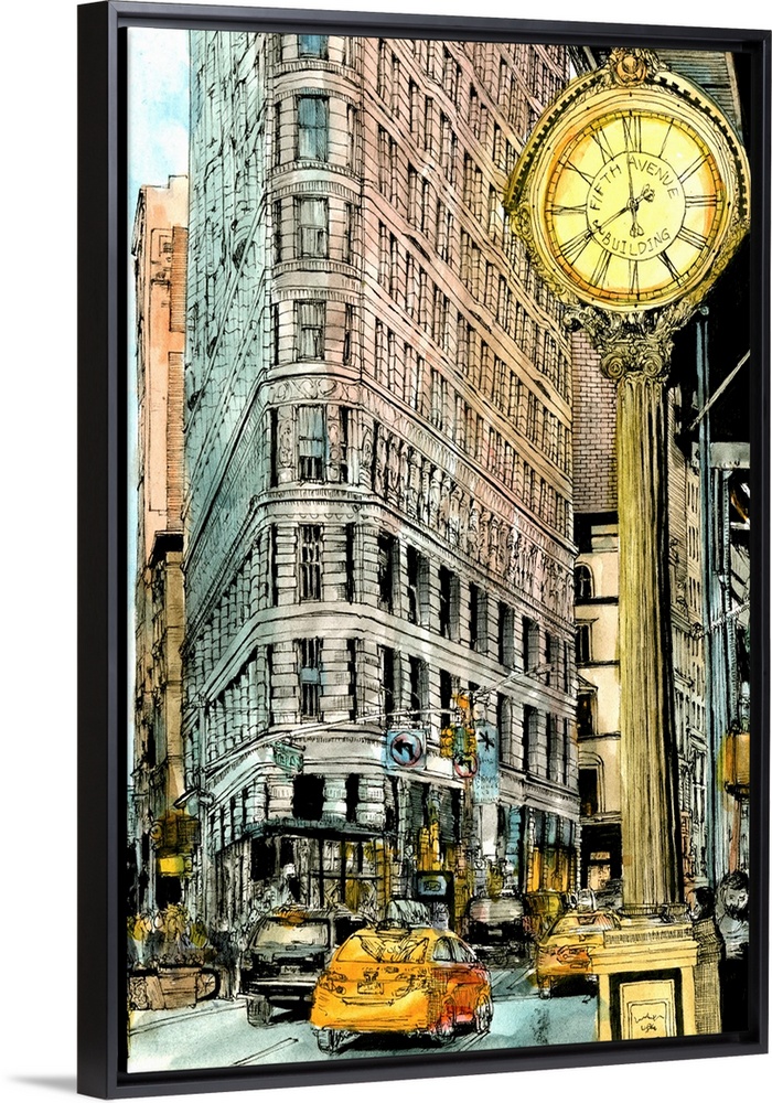 <p>Illustrated cityscape of New York City with taxi cabs and a street clock.</p>