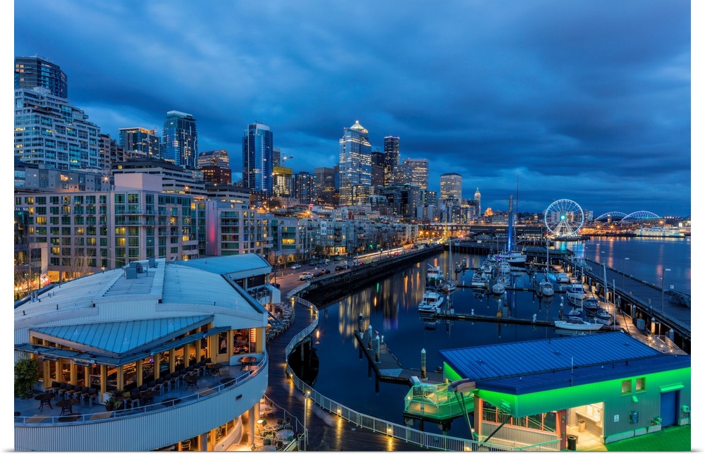 <p>City skyline at dusk from Bell Street Pier in Seattle, Washington, USA</p>