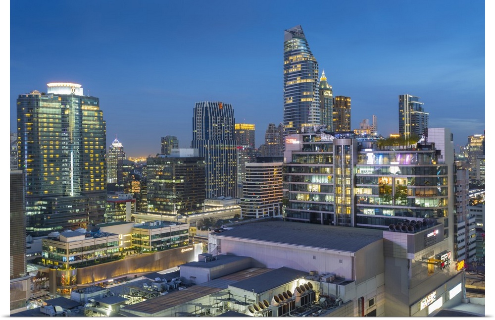 <p>City skyline at dusk from hotel rooftop bar, Bangkok, Thailand, Southeast Asia</p>