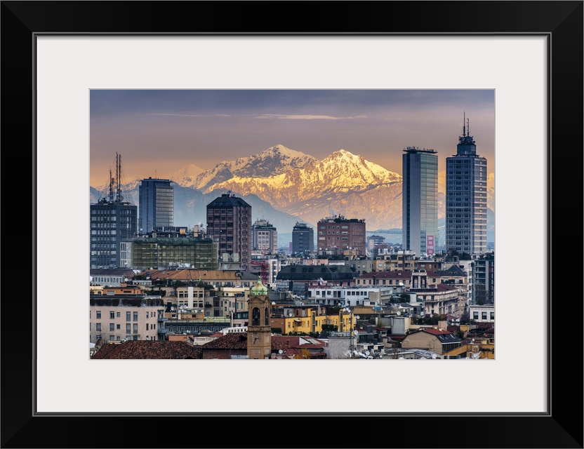 <p>City skyline at sunset with the snowy Alps in the background, Milan, Lombardy, Italy</p>