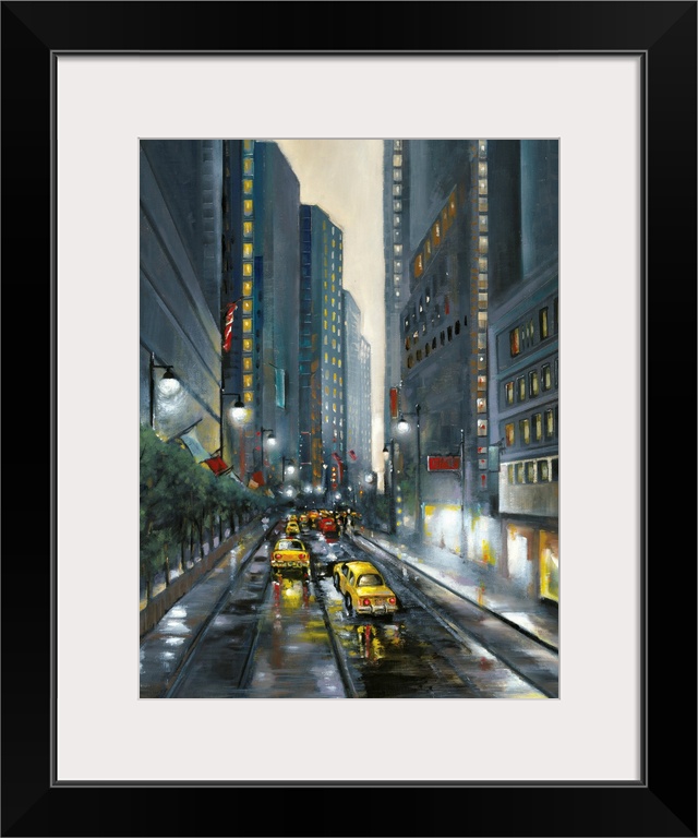 <p>Contemporary cityscape painting of a downtown city street lined with skyscrapers and filled with taxi cabs.</p>
