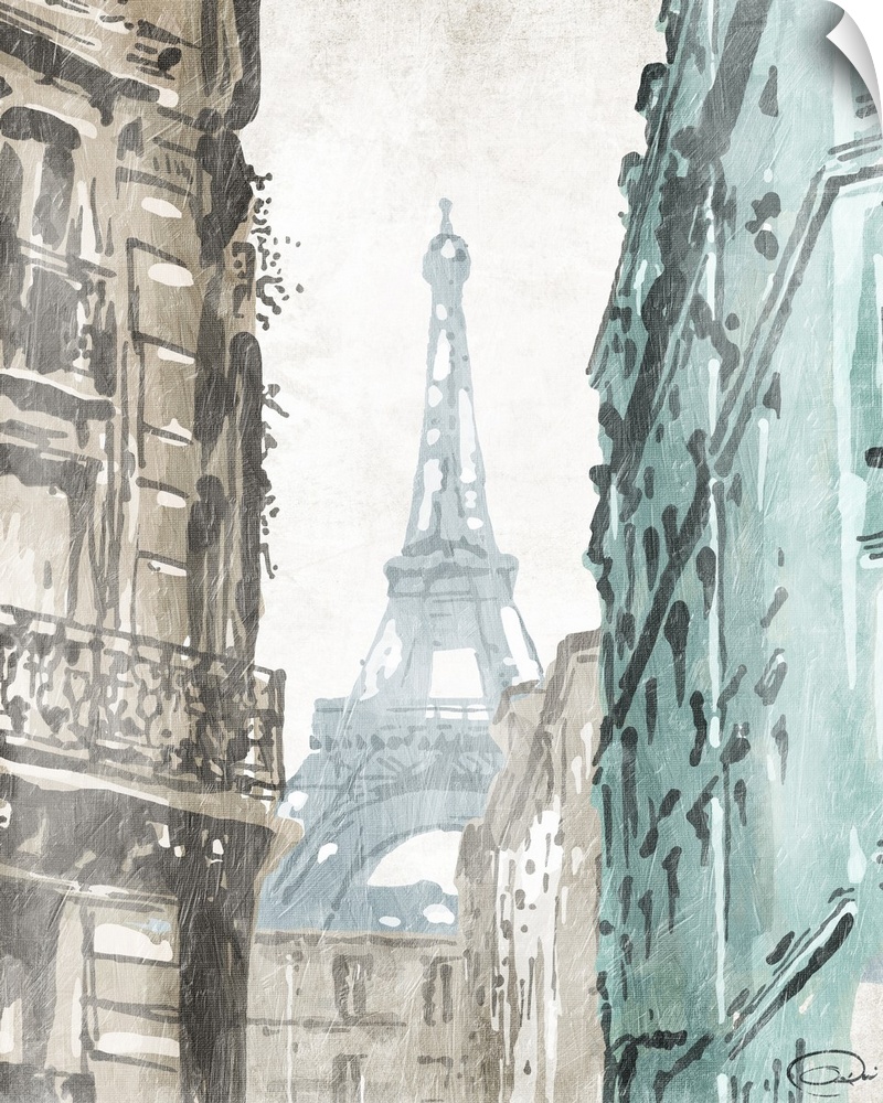 <p>Contemporary travel artwork of a view of the Eiffel Tower in Paris from a city block.</p>