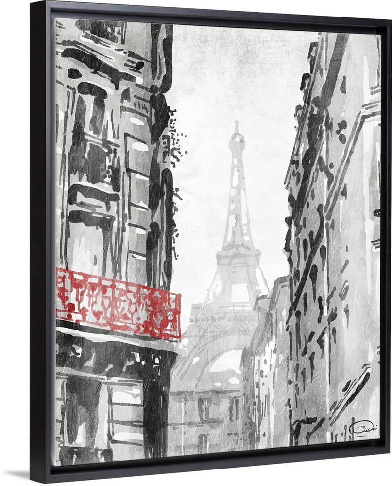 <p>Contemporary travel artwork of a view of the Eiffel Tower in Paris from a city block.</p>