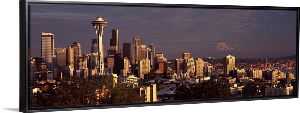 <p>Wide angle photograph taken from Queen Anne Hill of the Seattle skyline, including the Space Needle, against a dark sky as the sun sets.</p>
