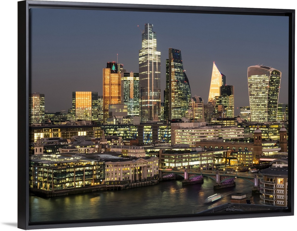 <p>Cityscape and skyline of London at dusk with 20 Fenchurch, 22 Bishopsgate, and various other skyscrapers, and the River Thames in the foreground; London, England.</p>