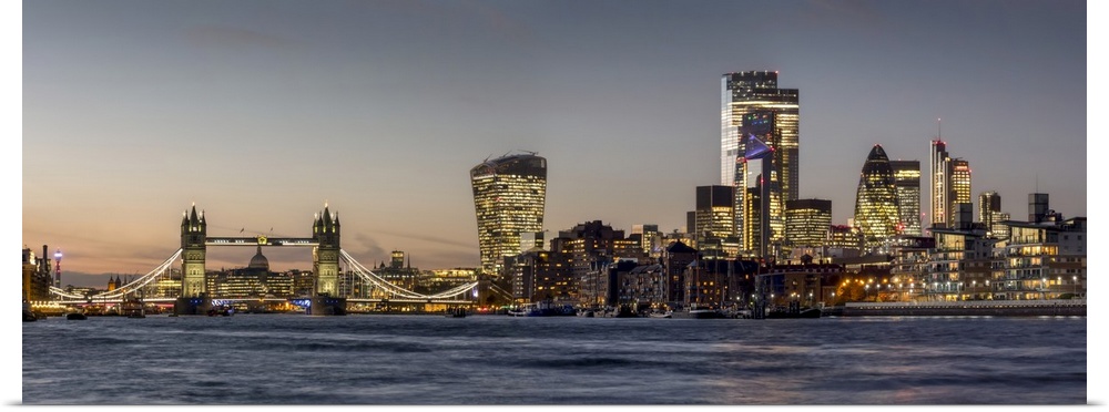 <p>Cityscape and skyline of London at dusk with 20 Fenchurch, 22 Bishopsgate, and various other skyscrapers, and the River Thames in the foreground; London, England.</p>