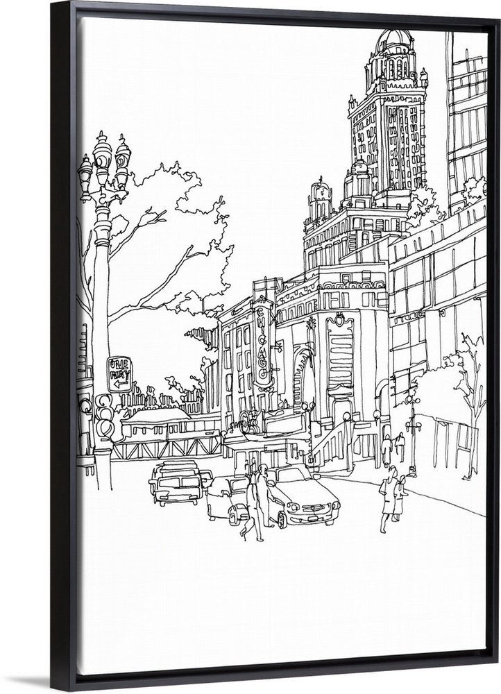 <p>Black and white cityscape illustration of downtown Chicago.</p>
