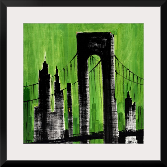 <p>Semi-abstract painting of silhouetted skyscrapers and bridge against a brightly colored sky.</p>