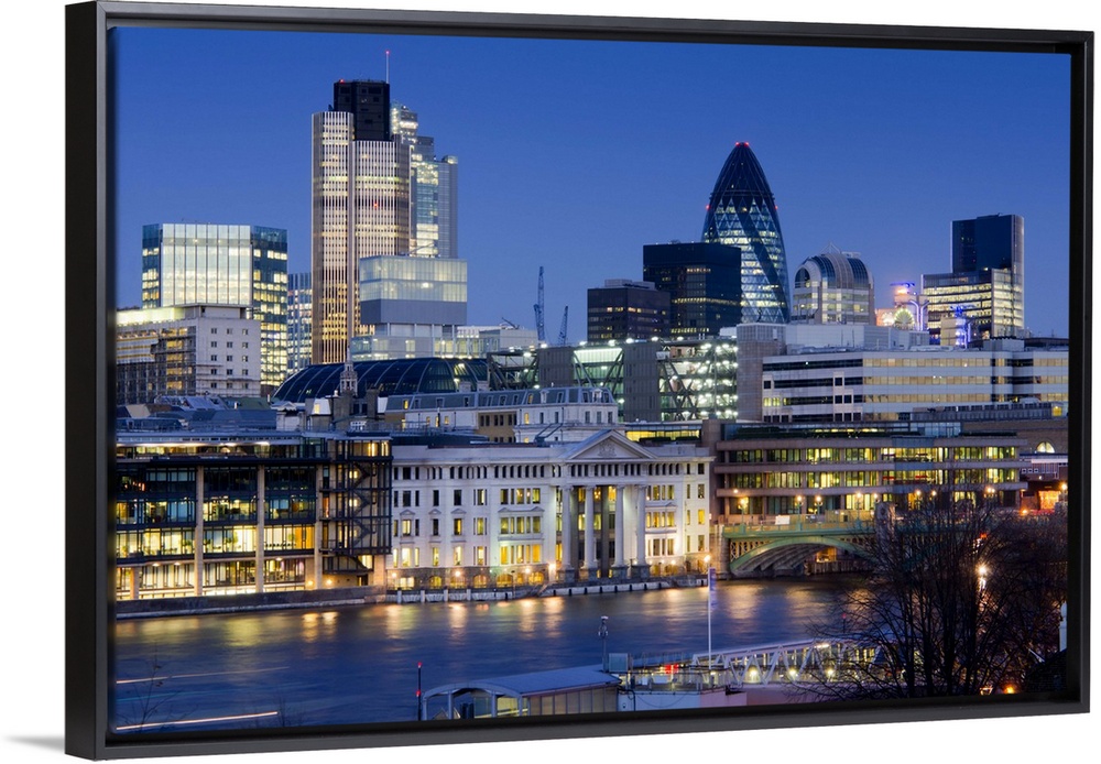<p>Skyline across River Thames shows the City of London at twilight. Buildings include Heron Tower, Gherkin and Nat west tower.</p>
