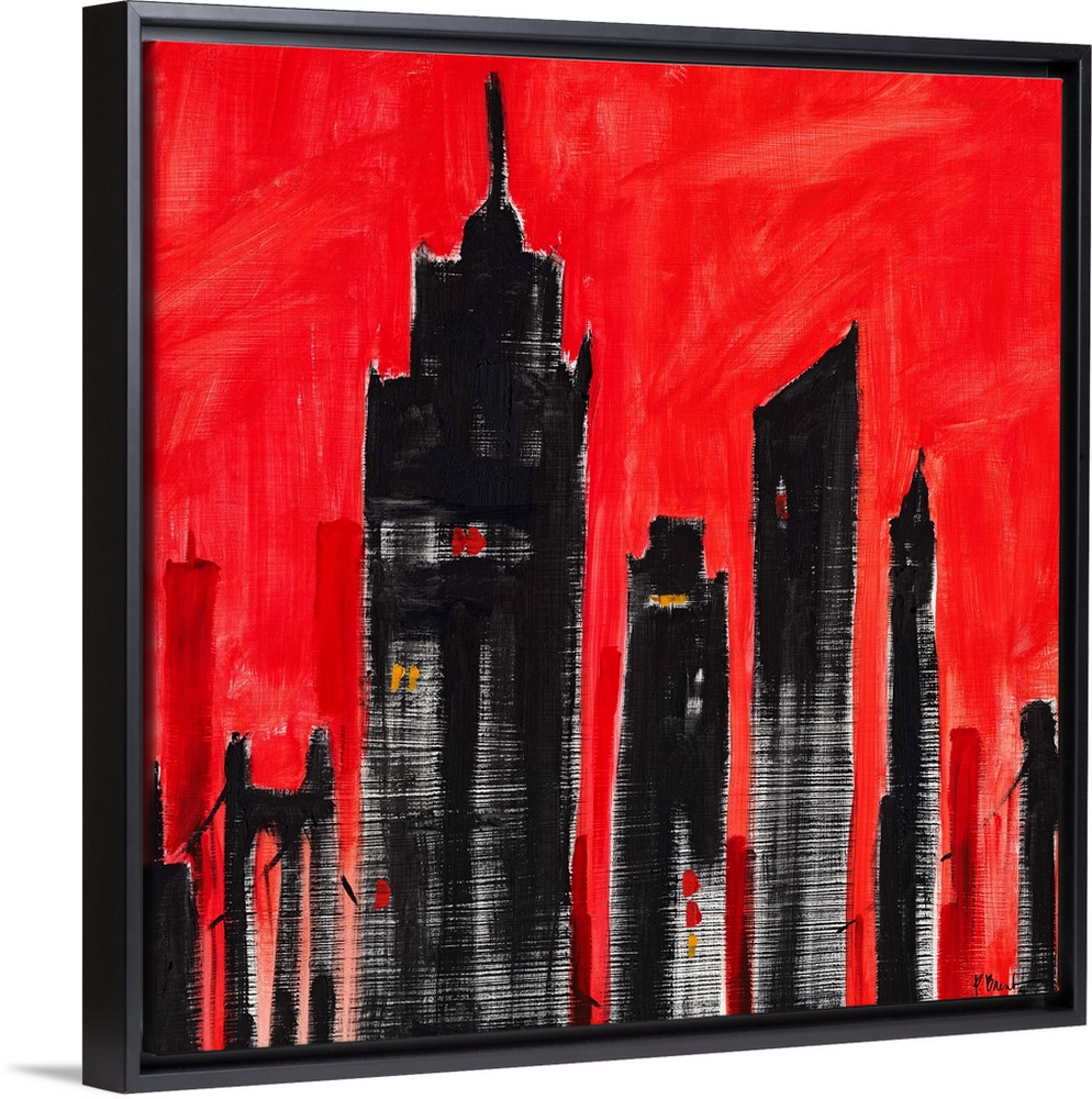 <p>Semi-abstract painting of silhouetted skyscrapers against a brightly colored sky.</p>